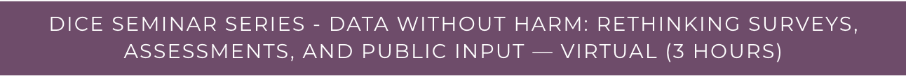 The Data Without Harm Seminar is a targeted 3-hour professional development session designed to help staff collect, interpret, and use community data responsibly—without causing harm, discouraging participation, or compromising the quality of input that agencies rely on for planning, service delivery, and decision-making.